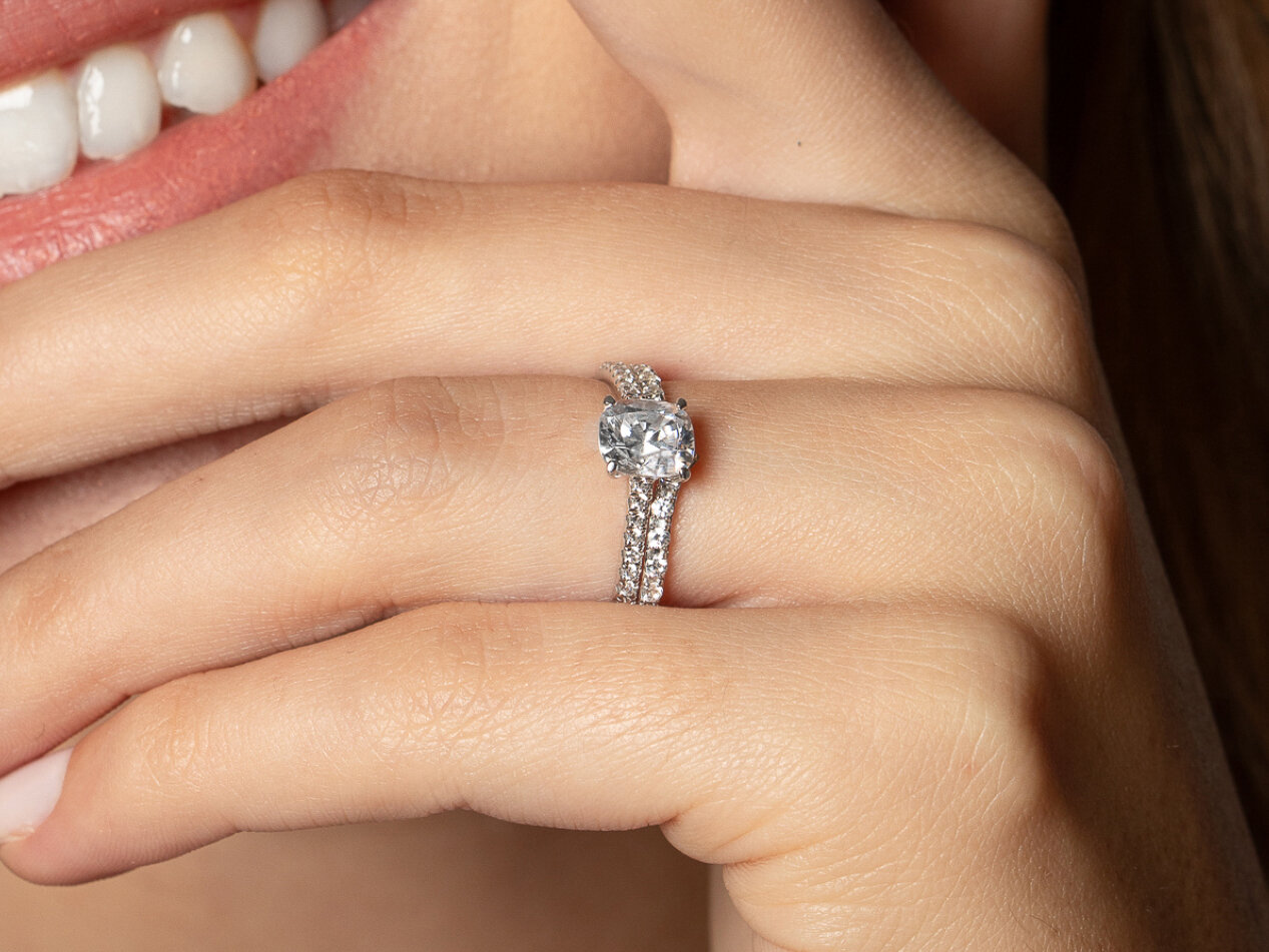 The Cushion Pavé engagement ring shines with a diamond-set ring band made up of glittering lights. An excitingly composed engagement ring model from our Cushion Diamond range. The cushion-cut main stone makes the Cushion Pavé stand out from the crowd - for individualists, connoisseurs and aficionados.