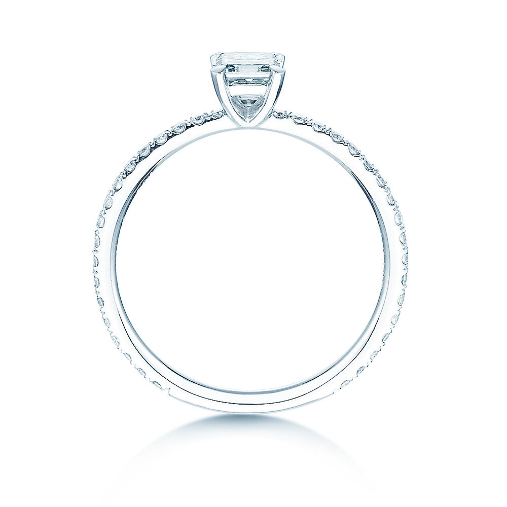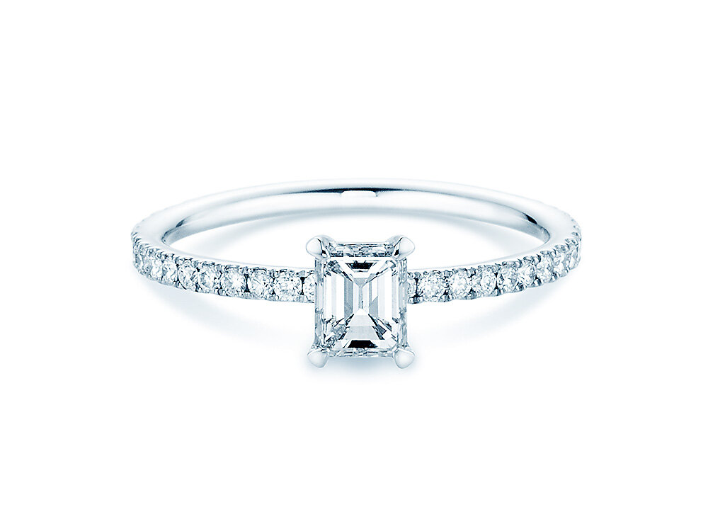 The magnificent Elaine model features a shimmering finish. The imposing emerald-cut half-carat is flanked on either side by 18 smaller diamonds. This concentration of brilliance gives the ring its feminine radiance.