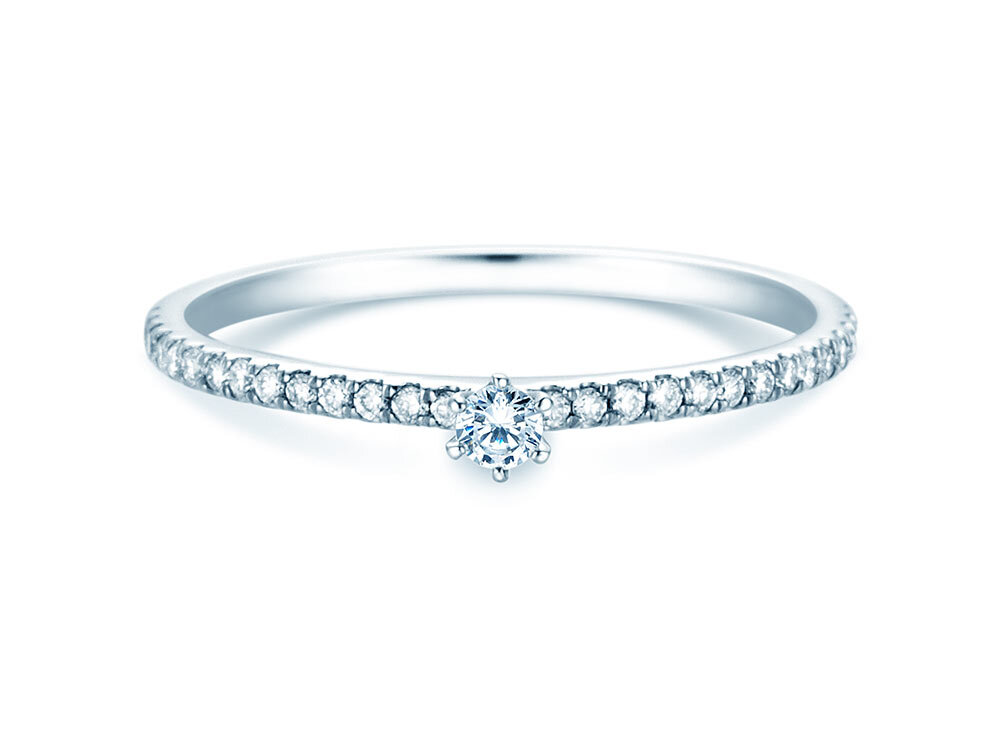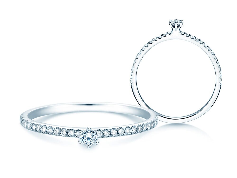 Engagement ring Classic Pavé with real diamonds. The main stone is set with six prongs, surrounded by small diamonds on the ring band. The stones on the ring band are called pavé and give the Classic Pavé diamond ring its noble look.