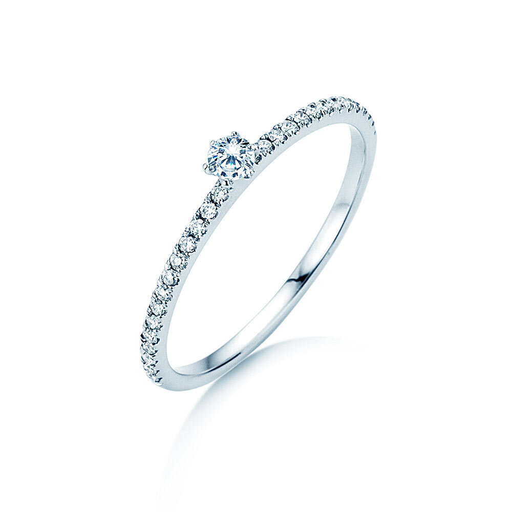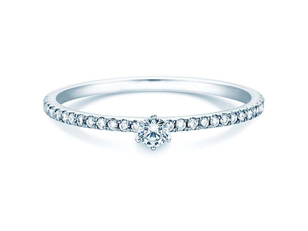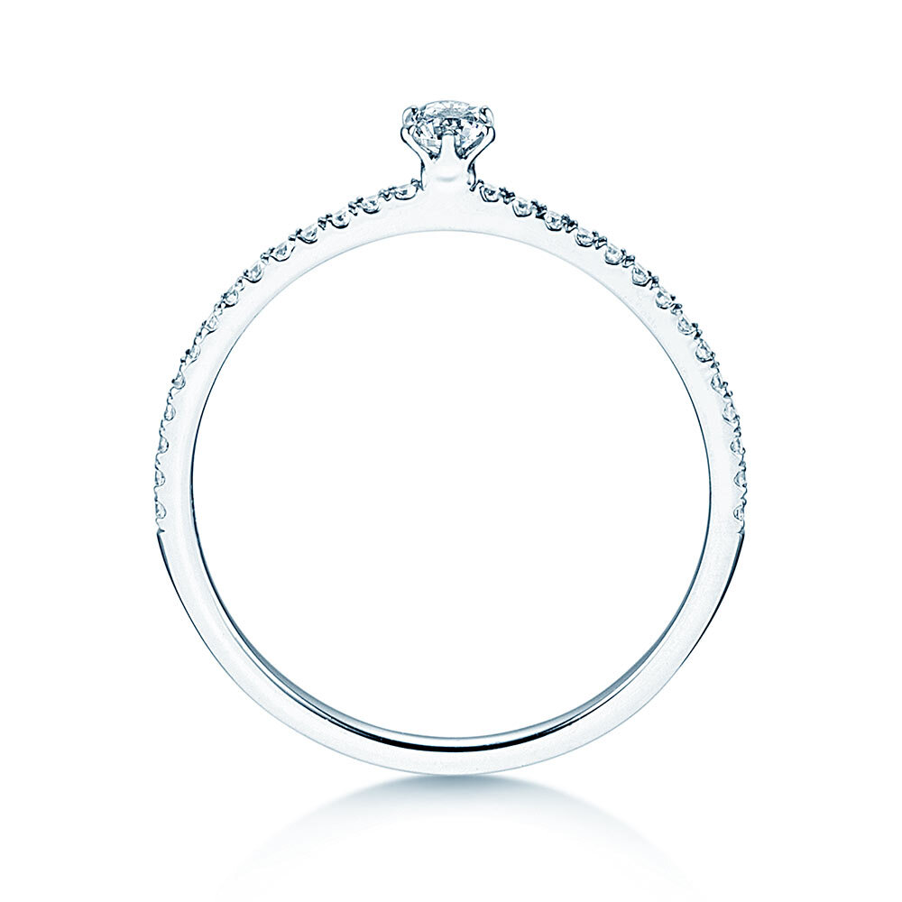Engagement ring Classic Pavé with real diamonds. The main stone is set with six prongs, surrounded by small diamonds on the ring band. The stones on the ring band are called pavé and give the Classic Pavé diamond ring its noble look.