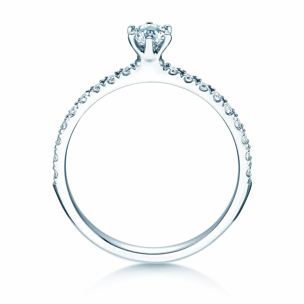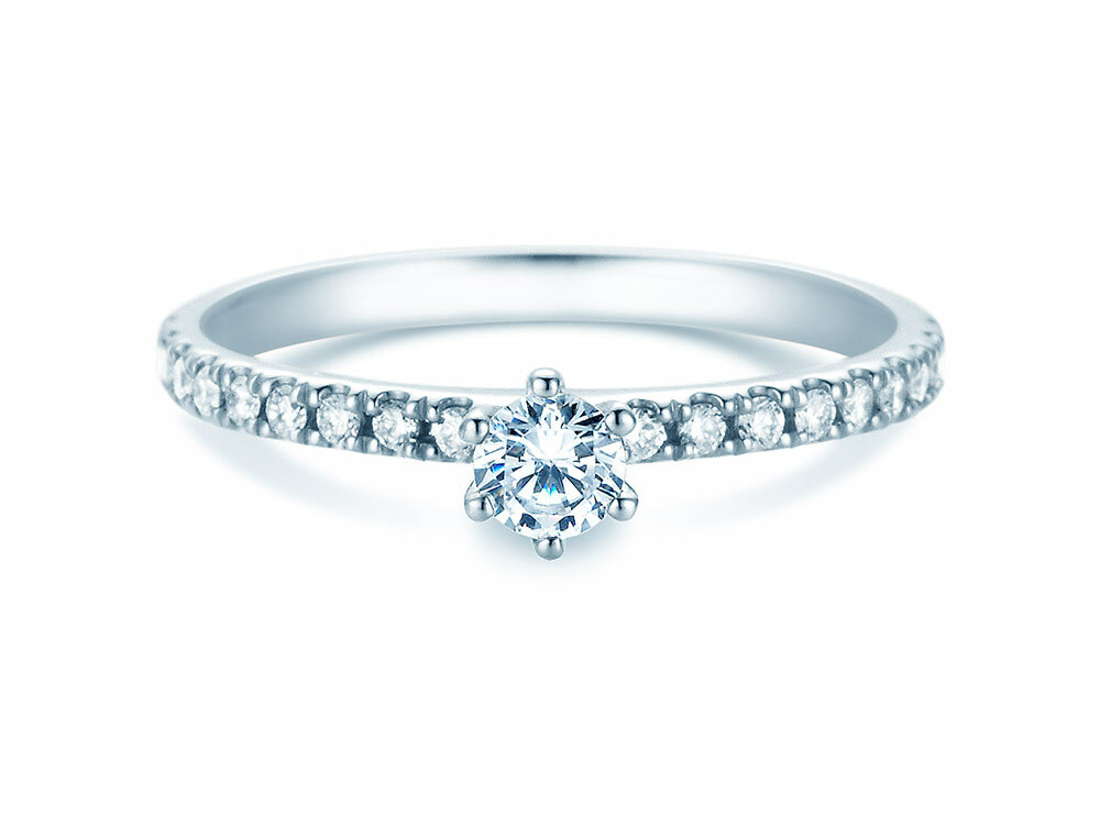Engagement ring Classic Pavé with real diamonds. The main stone is set with six prongs, surrounded by small diamonds on the ring band. The stones on the ring band are called pavé and give the Classic Pavé diamond ring its noble look.