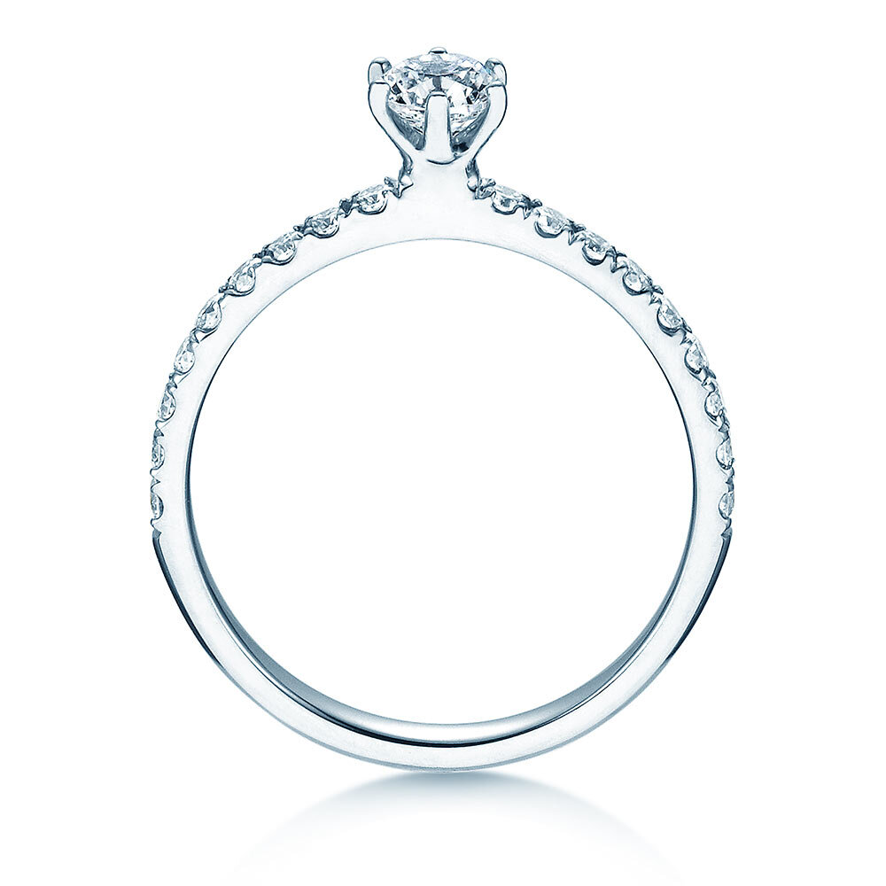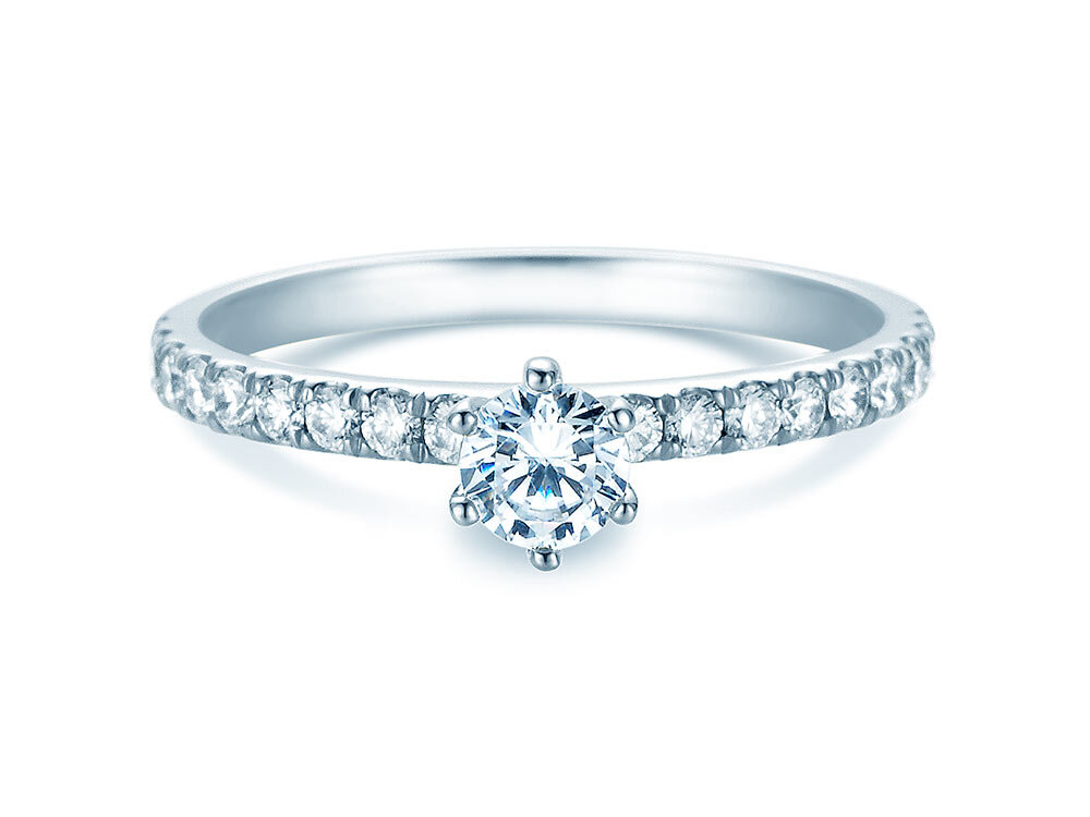 Engagement ring Classic Pavé with real diamonds. The main stone is set with six prongs, surrounded by small diamonds on the ring band. The stones on the ring band are called pavé and give the Classic Pavé diamond ring its noble look.