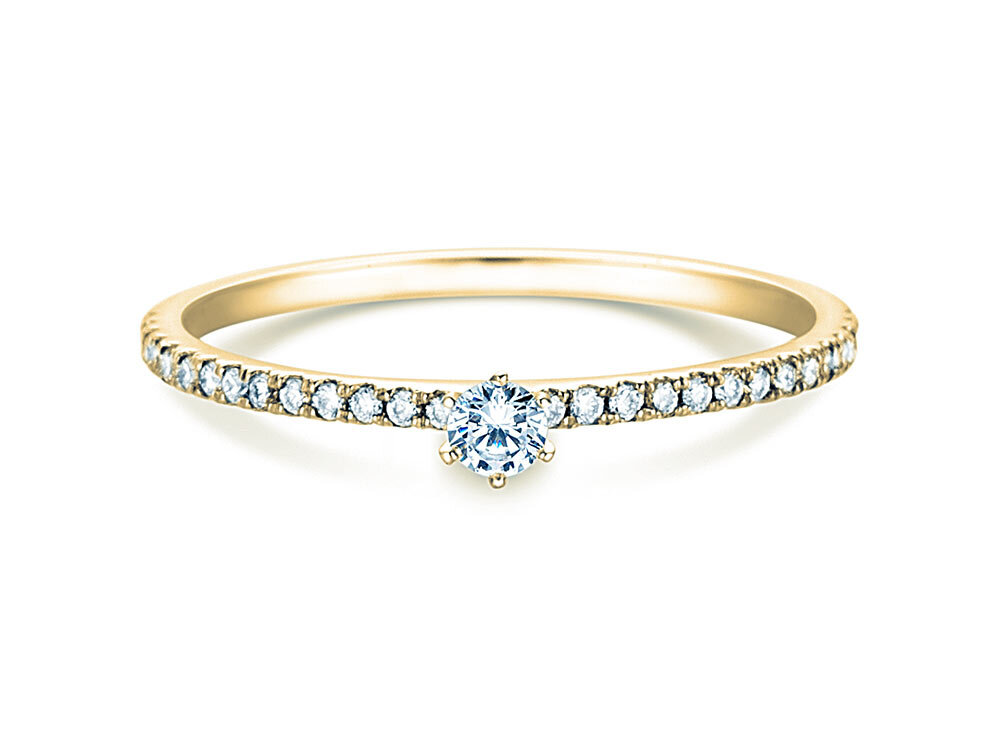 Engagement ring Classic Pavé with real diamonds. The main stone is set with six prongs, surrounded by small diamonds on the ring band. The stones on the ring band are called pavé and give the Classic Pavé diamond ring its noble look.