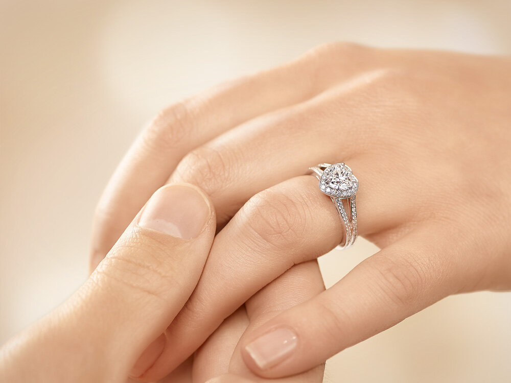 The engagement ring model Flame involuntarily pulls the viewer under its spell. The combination of perfectly shaped design, the diamond in the shape of a heart and lush pavé creates a sparkling play of light on the wearer's hand. This model was created to be the center of attention and to attract admiring glances from all sides.