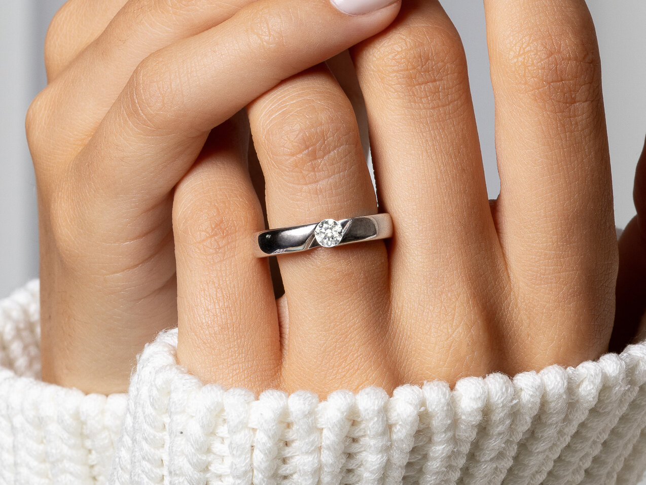 At first glance a classic chanel ring, simple and elegant. A closer look reveals the special design of the Italic engagement ring with diamond. Through the open sides of the ring band, light can enter the diamond, which makes it shine with a thousand bright light reflexes. The diamond is securely held by it's diagonal frame.