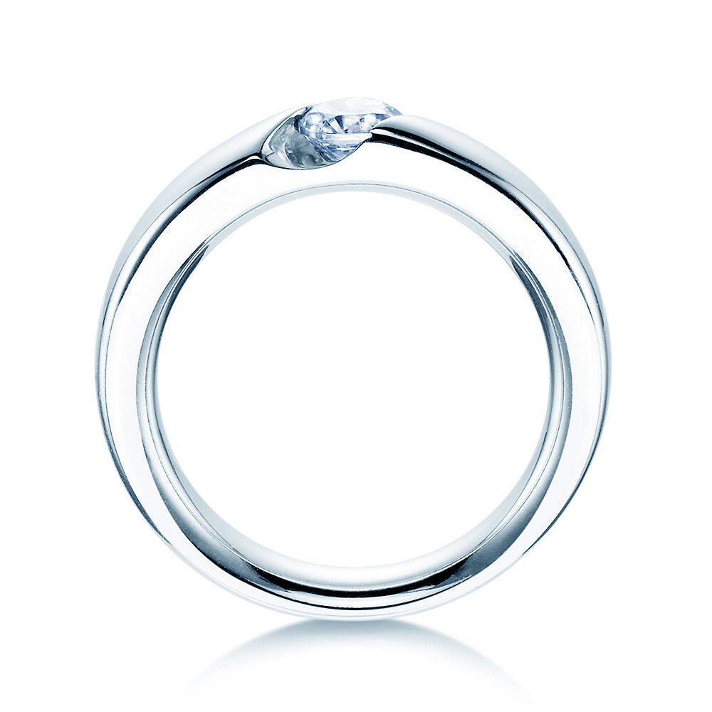 At first glance a classic chanel ring, simple and elegant. A closer look reveals the special design of the Italic engagement ring with diamond. Through the open sides of the ring band, light can enter the diamond, which makes it shine with a thousand bright light reflexes. The diamond is securely held by it's diagonal frame.