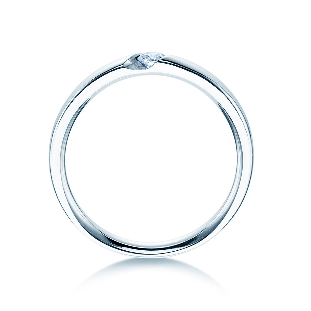 At first glance a classic chanel ring, simple and elegant. A closer look reveals the special design of the Italic engagement ring with diamond. Through the open sides of the ring band, light can enter the diamond, which makes it shine with a thousand bright light reflexes. The diamond is securely held by it's diagonal frame.