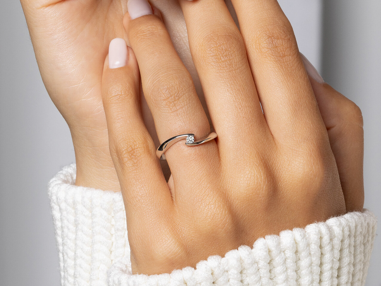 We developed the Twist Petite based on the success of our classic Twist model. The curved ring band has a modern and filigree look. The Twist Petite model costs between 279 € and 749 € and is available with 14 carat (58.5% pure gold) and 18 carat (75% pure gold) alloys. The ring is available in timeless white gold, modern rose gold or classic yellow gold. The most popular alloy is 14 carat white gold.
