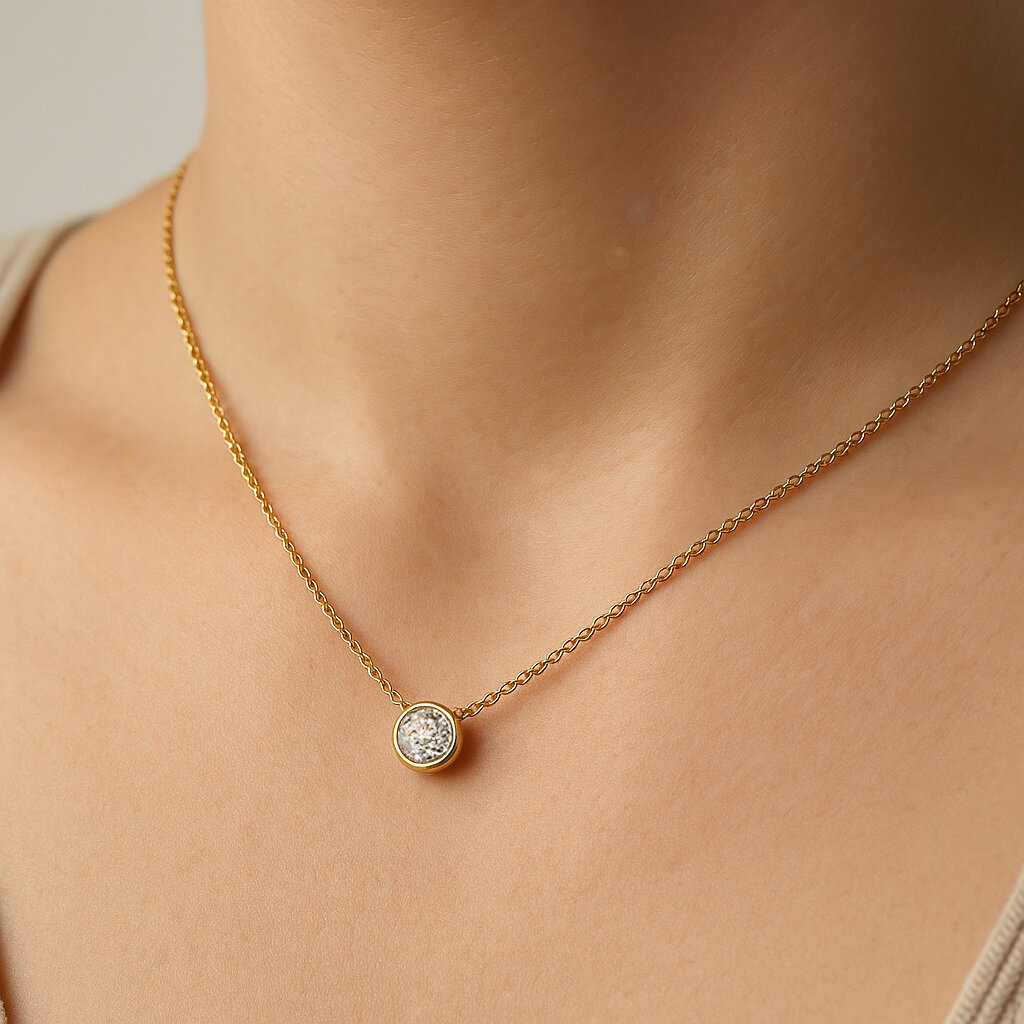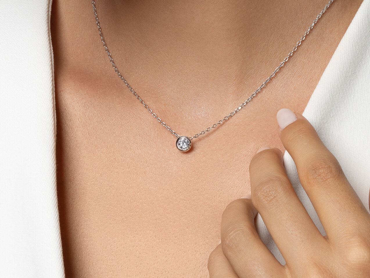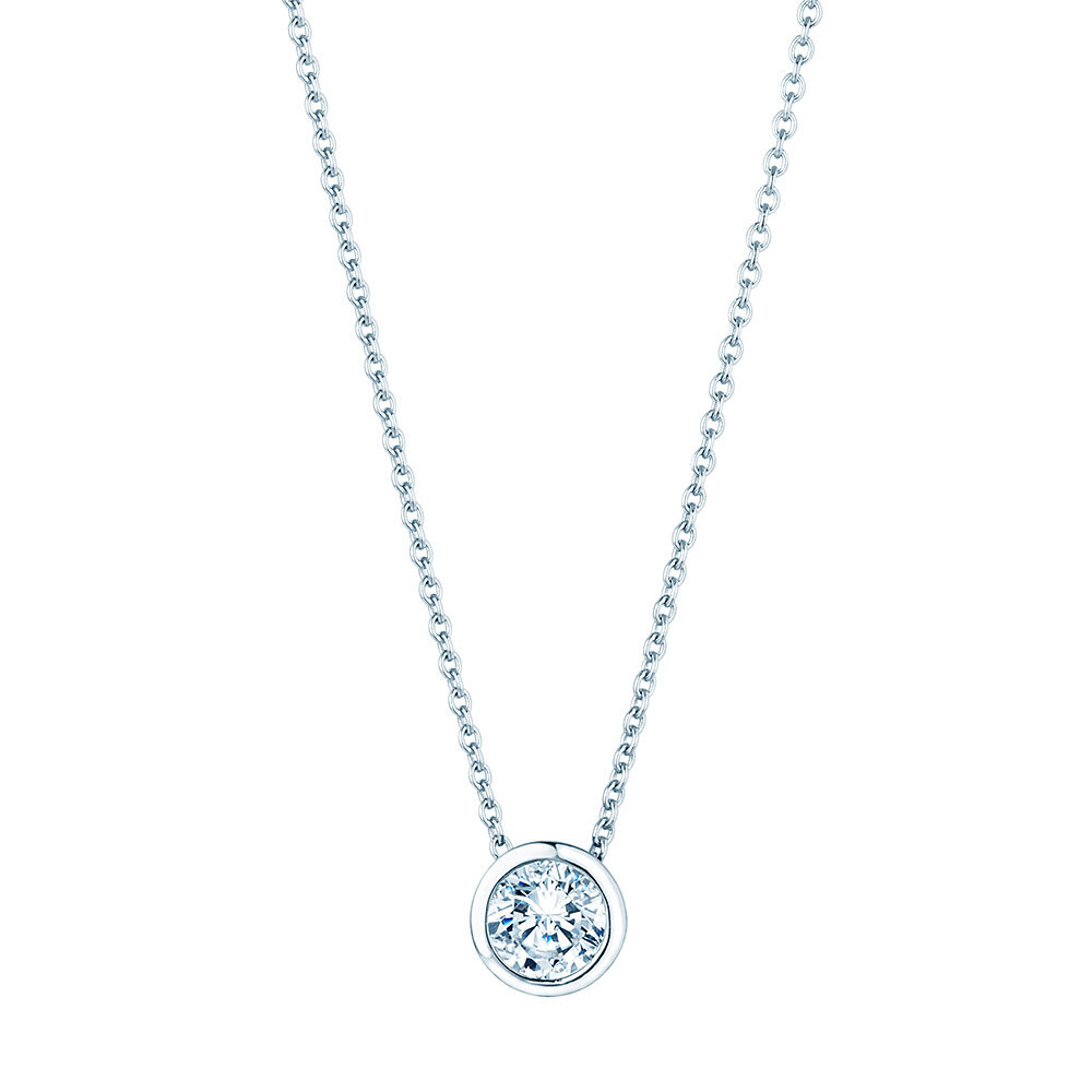 A classic, the Eternal pendant with a bezel setting. The pendant is timeless and makes an ideal gift. Choose between 18k gold and platinum and a diamond size between 0.15-1.00 carats.