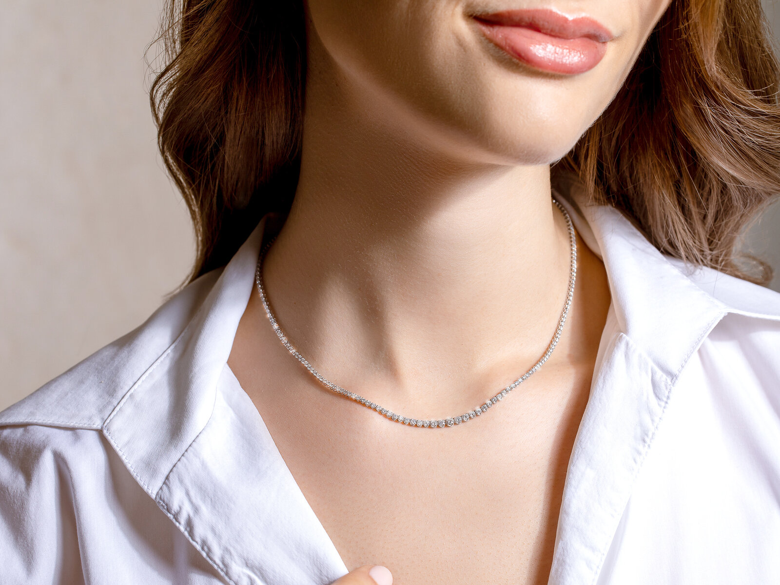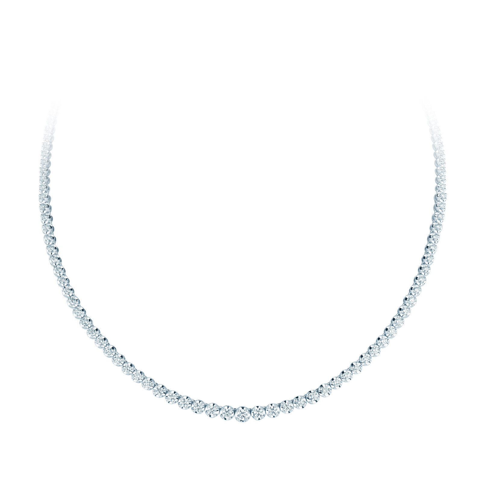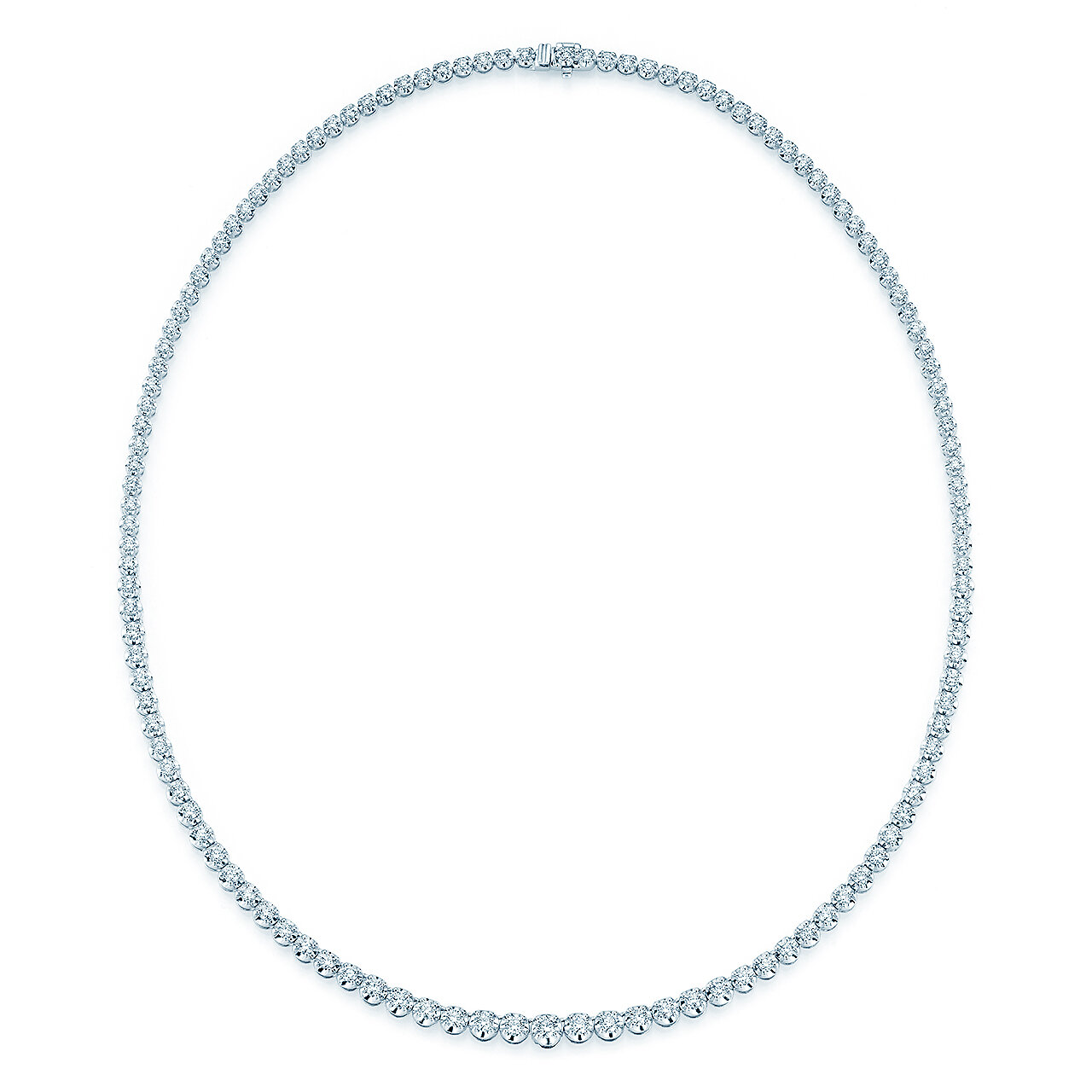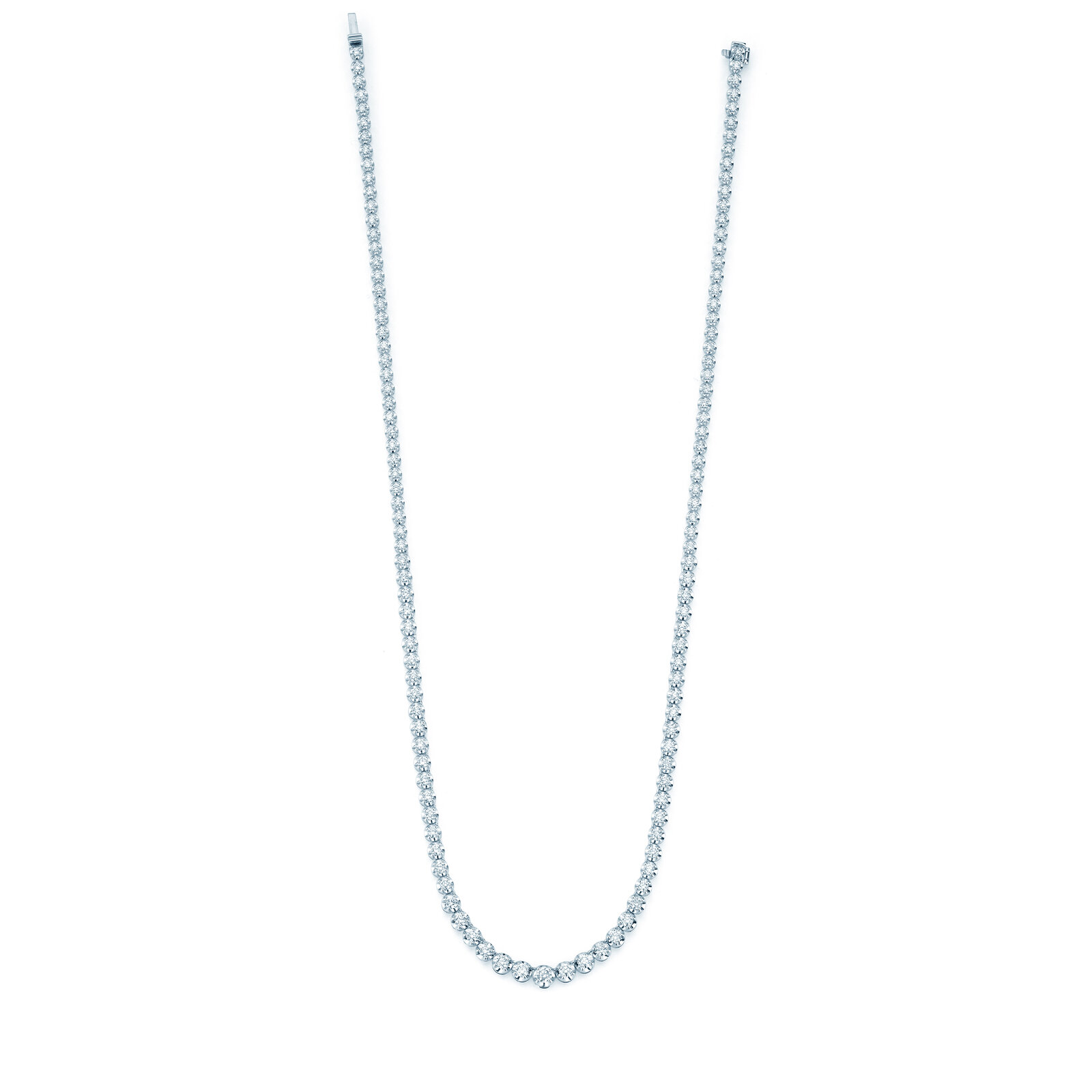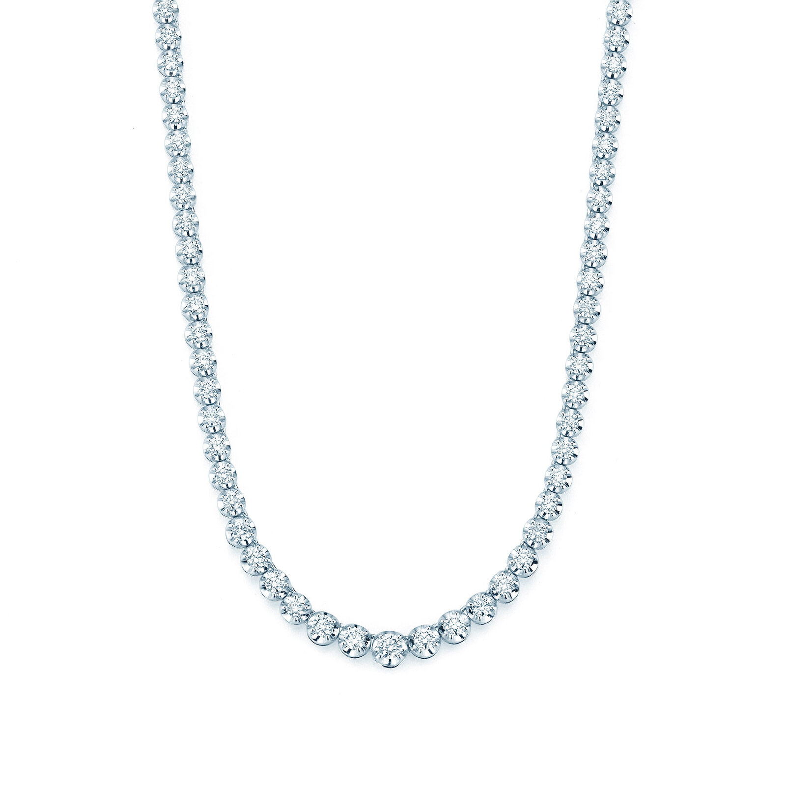 The classic tennis necklace is set entirely with diamonds, which increase in size towards the centre.