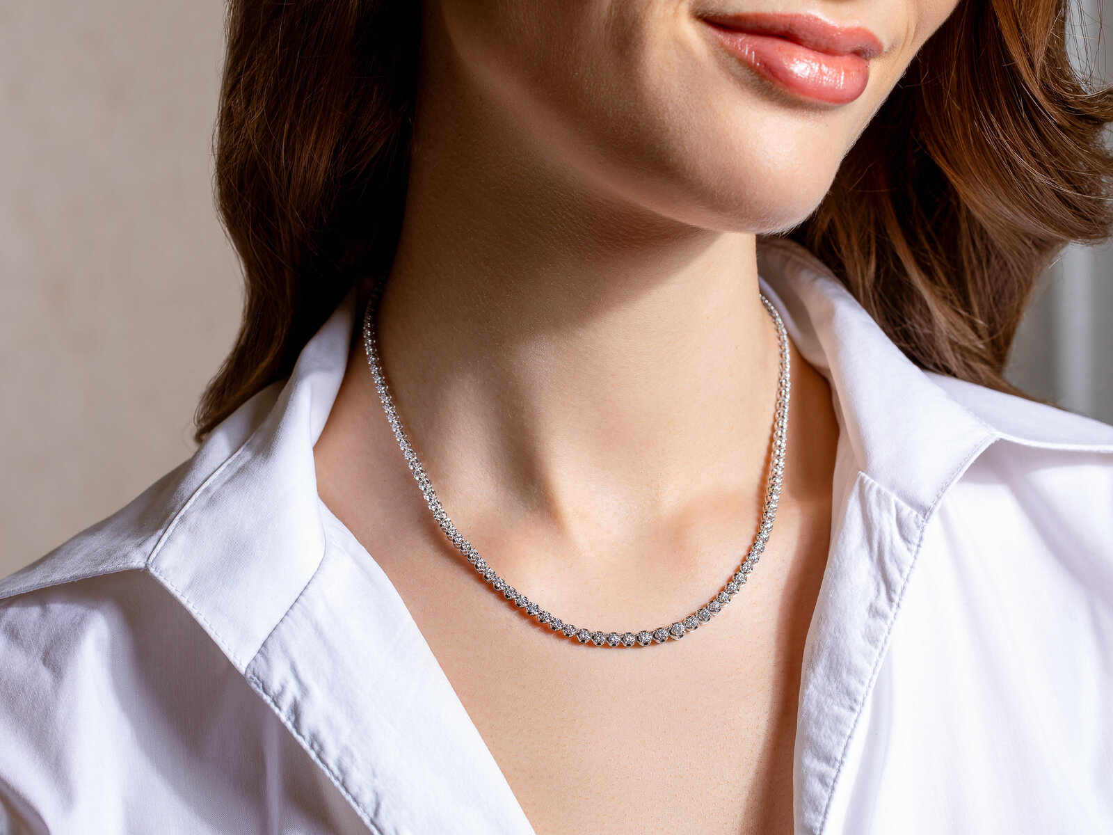 The classic tennis necklace is set entirely with diamonds, which increase in size towards the centre.