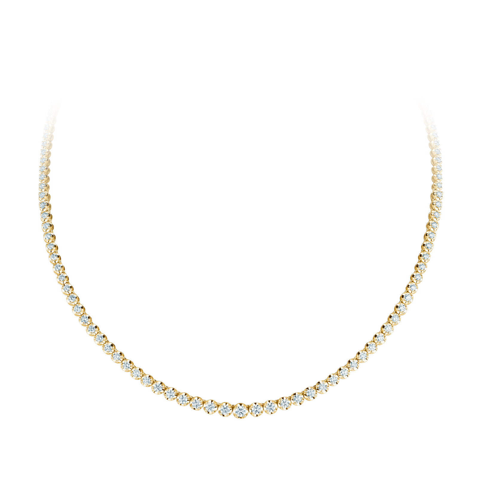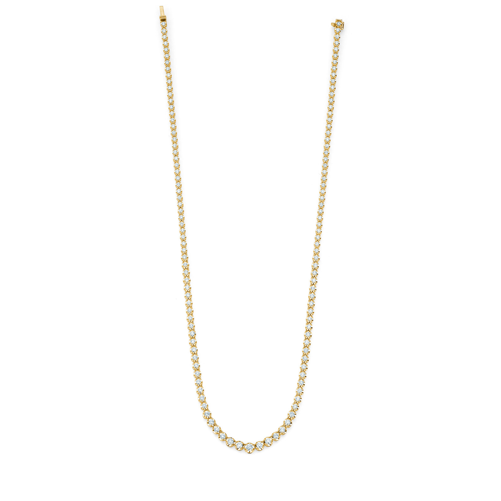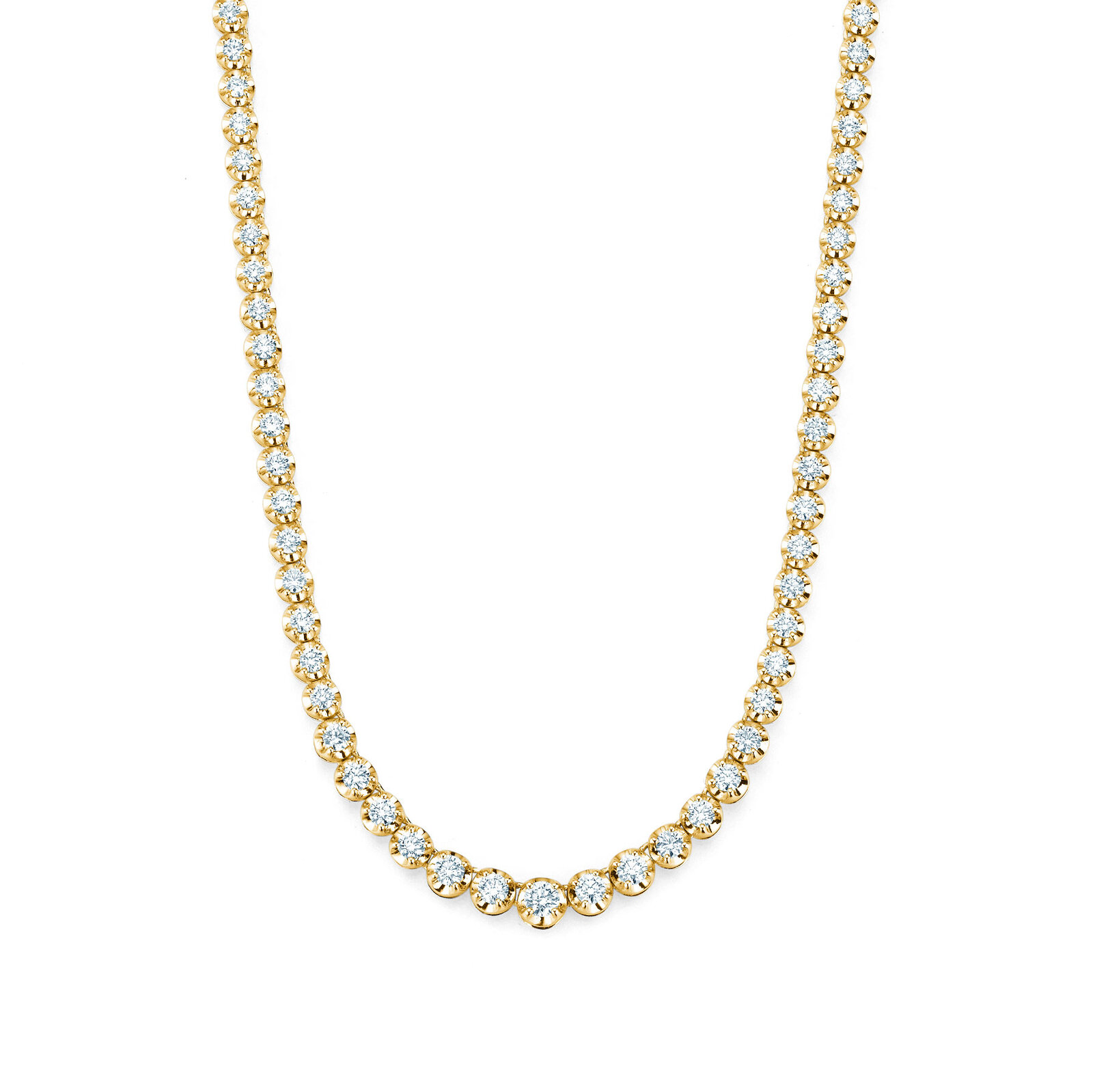 The classic tennis necklace is set entirely with diamonds, which increase in size towards the centre.